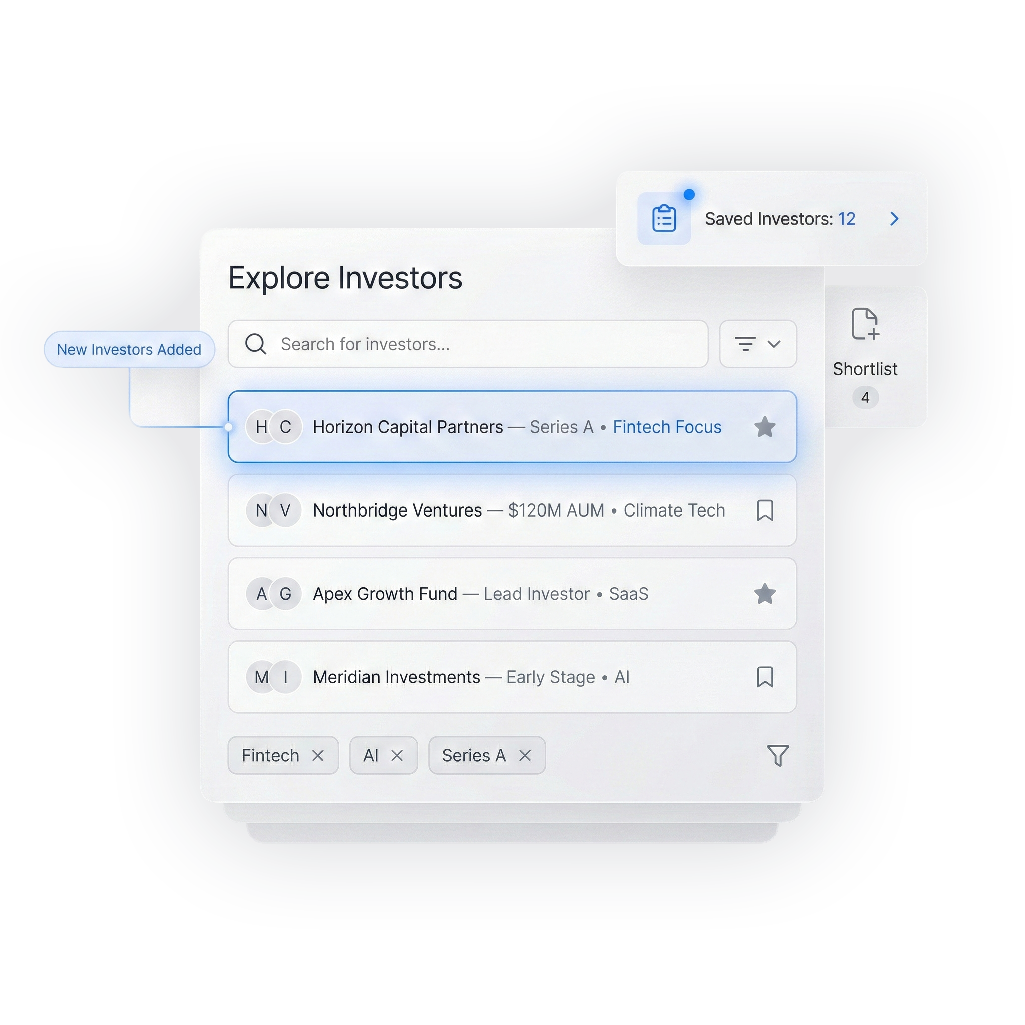 Enter keywords, metrics, or tags—and we’ll surface investors primed for your growth.