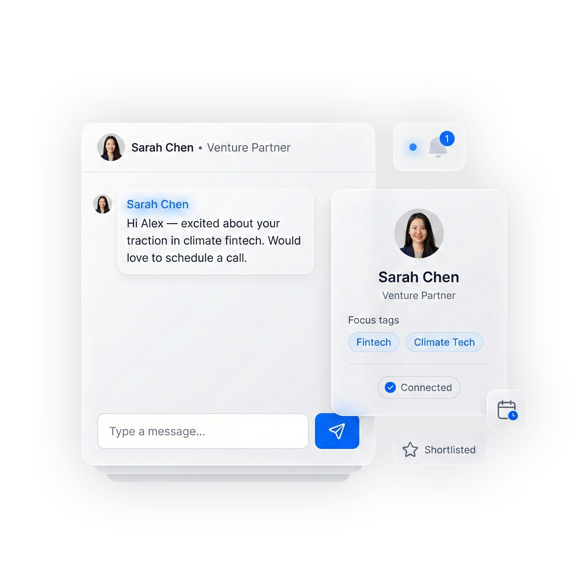 Shortlist top investors, send intros via email or LinkedIn, and manage real-time conversations instantly.